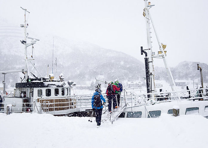 Ski well above the Arctice Circle at 70 degrees north on some very remote Norwegian islands. How do we get there? A boat, but not just any boat, the amazing Vulkana arctic spa boat.